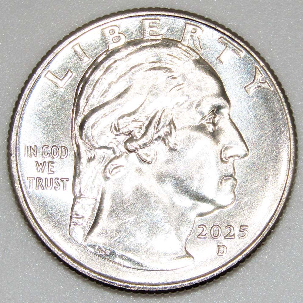 На аверсе: В центре располагается профильный портрет Джорджа Вашингтона. Вверху расположена надпись “LIBERTY”. Слева выгравирована надпись “IN GOD WE TRUST”, в правой нижней части монеты указан год эмиссии «2025», ниже указан монетный двор.
