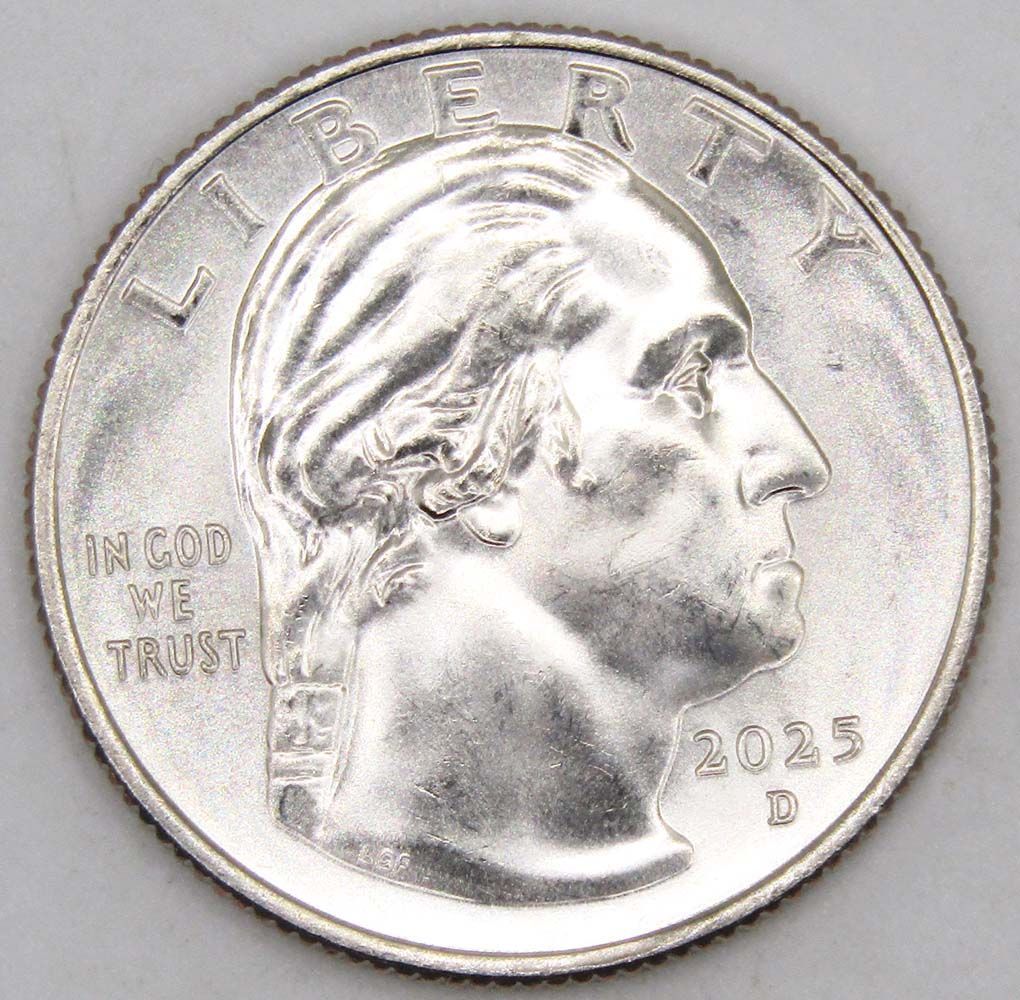 На аверсе: В центре располагается профильный портрет Джорджа Вашингтона. Вверху расположена надпись “LIBERTY”. Слева выгравирована надпись “IN GOD WE TRUST”, в правой нижней части монеты указан год эмиссии «2025», ниже указан монетный двор.