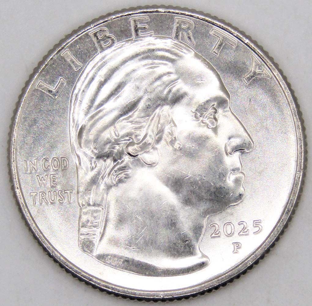 На аверсе: В центре располагается профильный портрет Джорджа Вашингтона. Вверху расположена надпись “LIBERTY”. Слева выгравирована надпись “IN GOD WE TRUST”, в правой нижней части монеты указан год эмиссии «2025», ниже указан монетный двор.