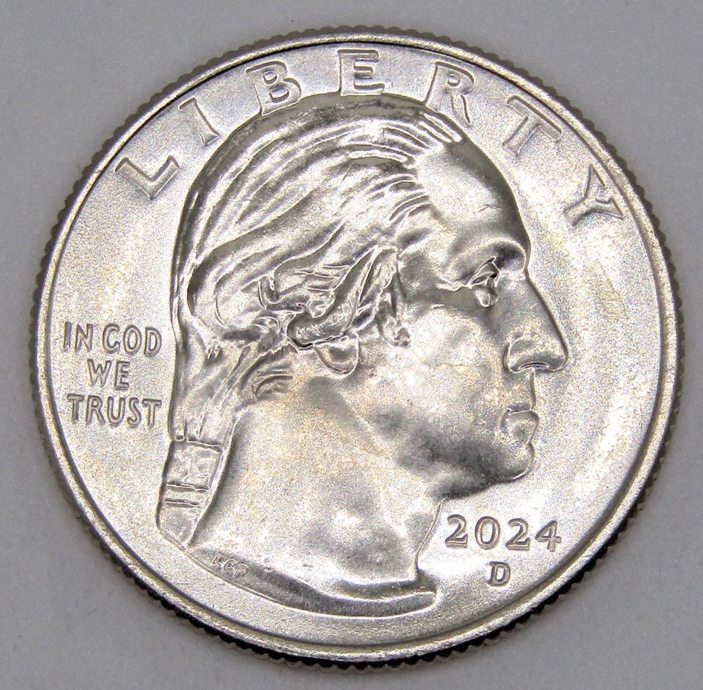 На аверсе: В центре располагается профильный портрет Джорджа Вашингтона. Вверху расположена надпись “LIBERTY”. Слева выгравирована надпись “IN GOD WE TRUST”, в правой нижней части монеты указан год эмиссии «2024», ниже указан монетный двор.