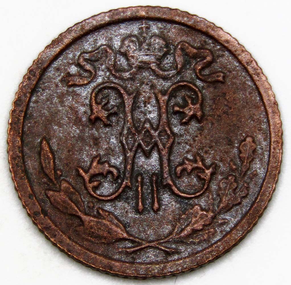 Аверс монеты 1/2 копейки 1915 года: вверху Корона Российской империи с выходящими из нее двумя лентами, ниже вензель Николая II, под ним две скрещенные ветви: слева лавровая, справа дубовая.