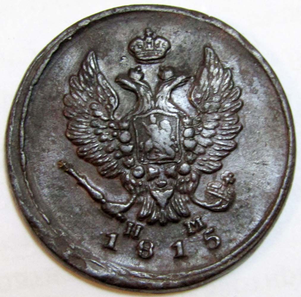 Аверс монеты 2 копейки 1815 года Александр I: вдоль края монеты ободок из точек, в середине двуглавый орел с поднятыми крыльями, увенчанный тремя коронами, на груди орла герб Москвы, окруженный цепью Ордена Святого Андрея Первозванного, в левой лапе скипетр, в правой держава, слева и справа под хвостом инициалы минцмейстера «НМ» (Николай Мундт), ниже год выпуска «1815».