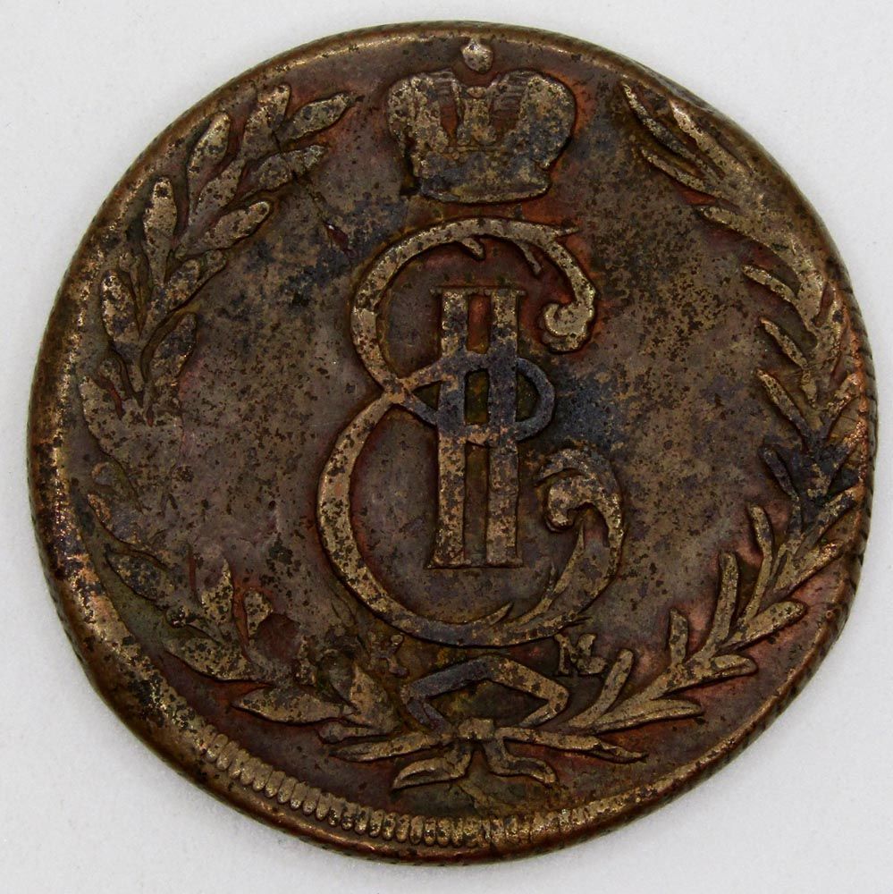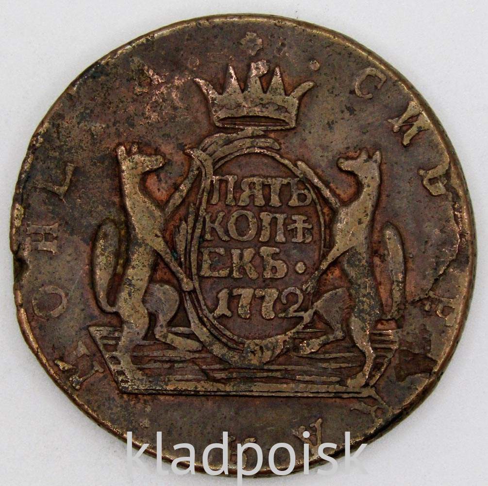 Реверс: в центре, в картуше, поддерживаемом двумя соболями, номинал – «ПЯТЬ», под ним «КОП», ниже «ЕК.» (пять копеек), под ним дата выпуска – «1772». Слева вдоль края надпись «МОНЕТА», справа – «СИБИРСКАЯ», в центре вверху крест, под ним корона.
