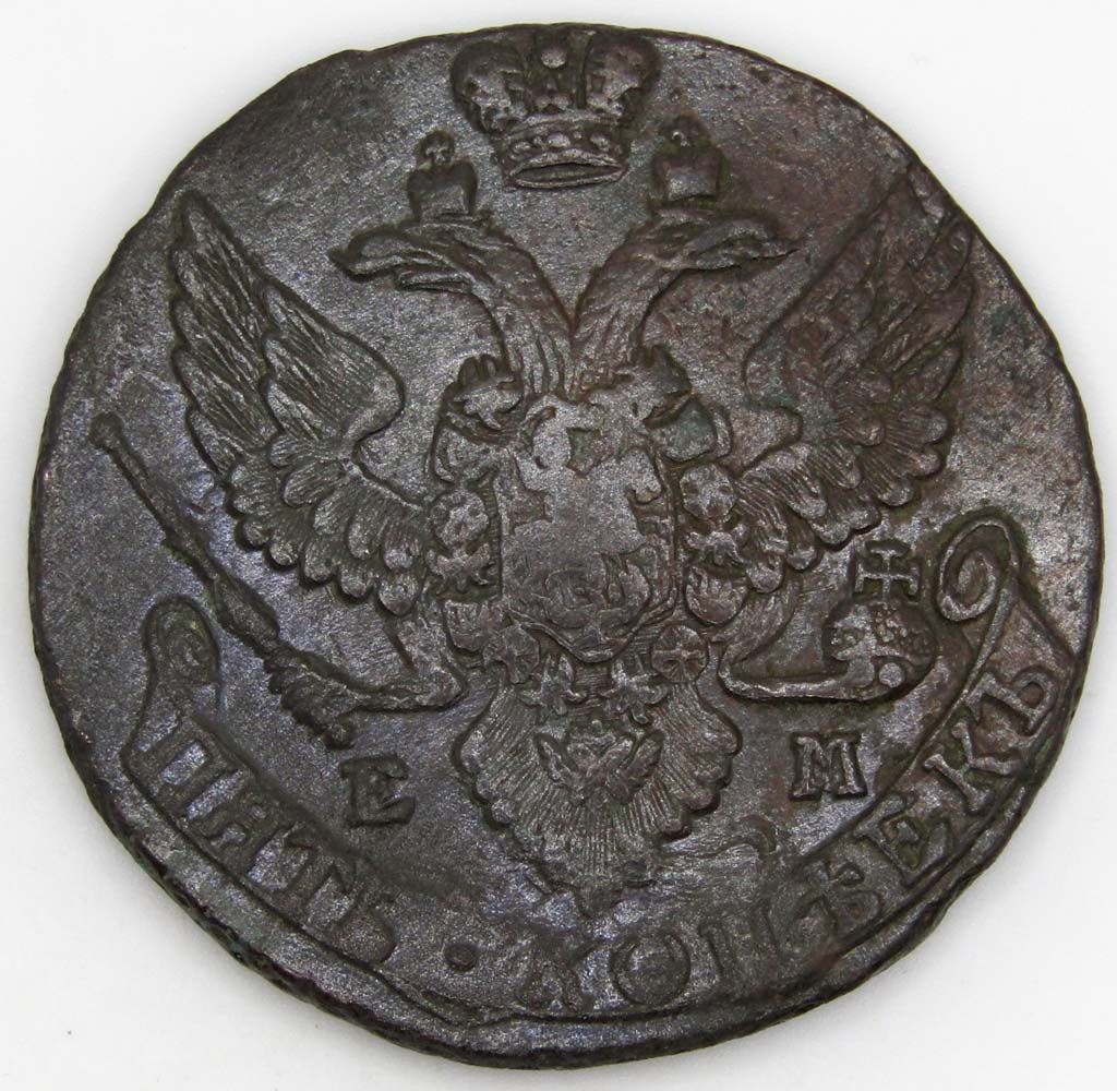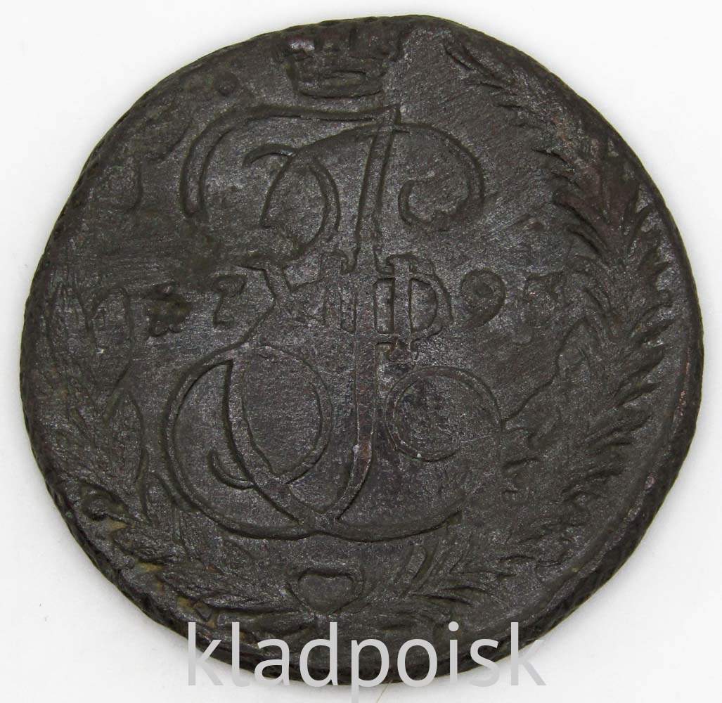 Реверс монеты 5 копеек Российской Империи 1795 года: в центре вензель Екатерины II «ЕII», увенчанный императорской короной. По сторонам от него - год чеканки «1795». Слева вдоль края монеты – лавровая ветвь, справа – пальмовая, внизу они перевязаны лентой.