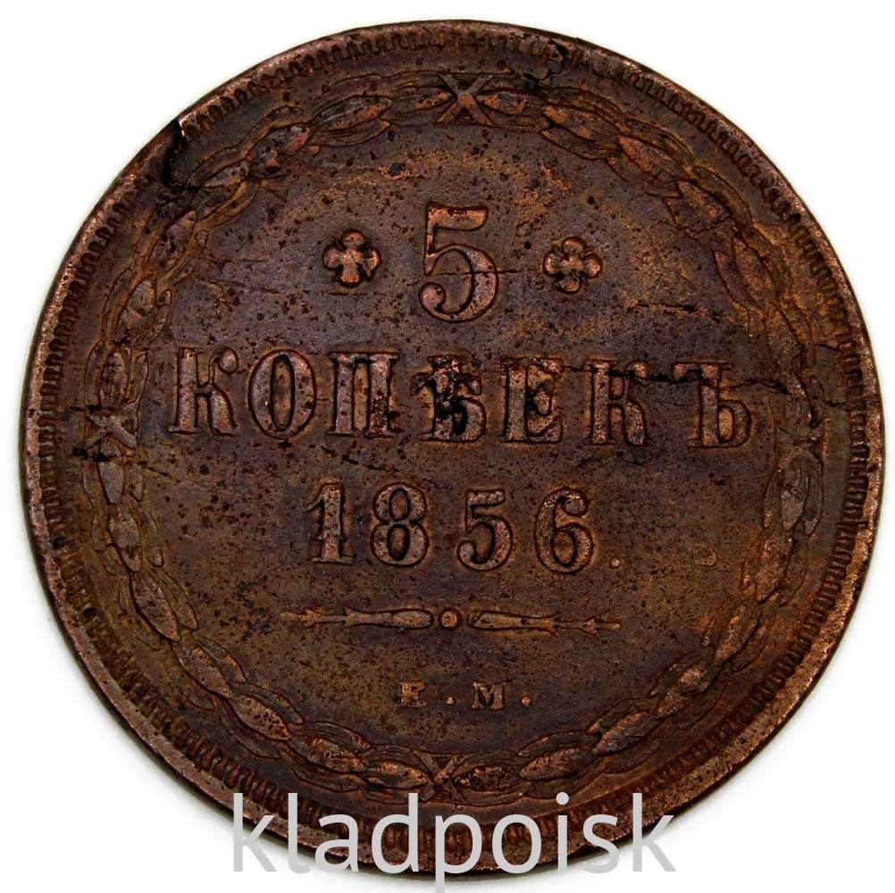 Реверс монеты Царской России 5 копеек 1856 года: вдоль края монеты венок вверху, внизу, слева и справа крестообразно перехваченный лентами, внутри венка вверху обрамленный слева и справа цветочными розетками номинал монеты цифра «5», ниже слово «КОПЕЕК», под ним год выпуска монеты «1856», ниже две смотрящие в разные стороны фигурные черты и под ними обозначение монетного двора «ЕМ».