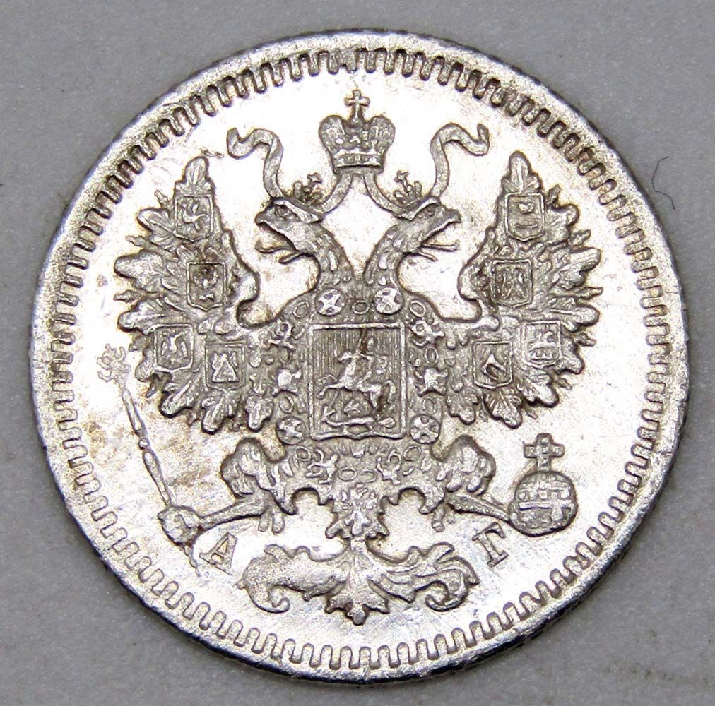 Аверс монеты 5 копеек 1884 года: в середине Малый Государственный Герб Российской империи, внизу вдоль края монеты слева и справа от хвоста орла инициалы минцмейстера «АГ» (Аполлон Грасгоф).