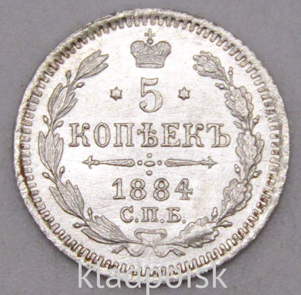 Реверс монеты 5 копеек 1884 года: слева вдоль края монеты лавровая ветвь, справа дубовая, внизу ветви соединяются и перевязаны лентой, в середине вверху Корона Российской империи, под ней обрамленный слева и справа звездочками номинал монеты - цифра «5», ниже слово «КОПЕЕК», под ним две направленные в разные стороны фигурные черты и ниже год выпуска монеты «1884», под ним обозначение монетного двора «СПБ».
