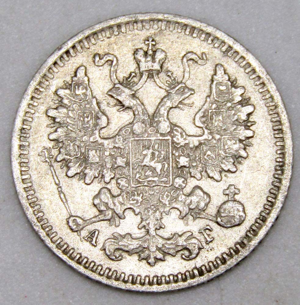 Аверс монеты 5 копеек 1884 года: в середине Малый Государственный Герб Российской империи, внизу вдоль края монеты слева и справа от хвоста орла инициалы минцмейстера «АГ» (Аполлон Грасгоф).