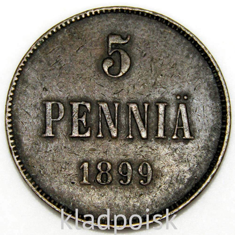 Реверс монеты: вверху обозначение достоинства монеты «5», ниже слово «PENNIA», под ним год выпуска монеты «1899».