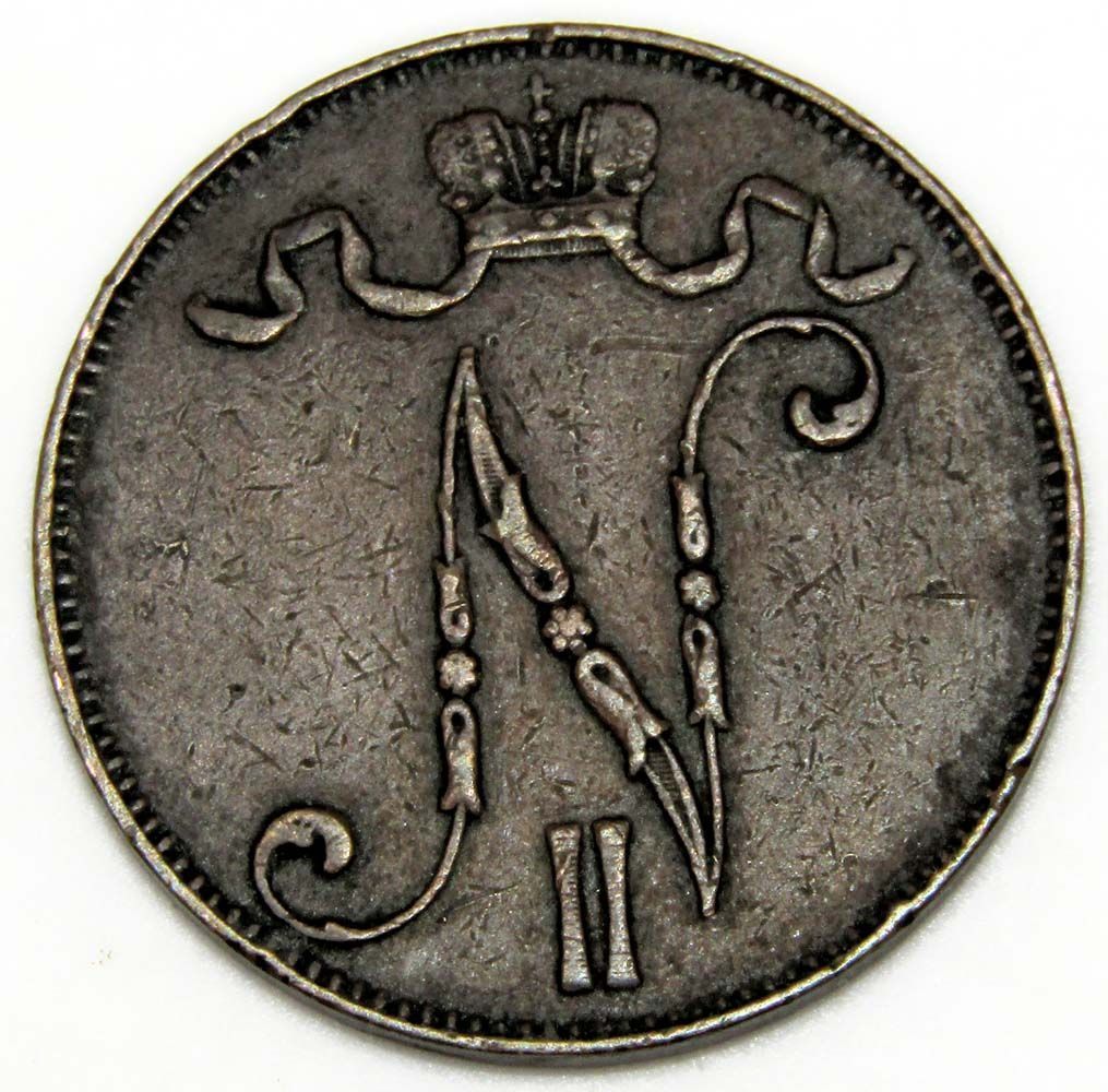 Аверс монеты 5 пенни 1899 г.: вверху Корона Российской империи с двумя выходящими из нее лентами, ниже вензель Николая II.