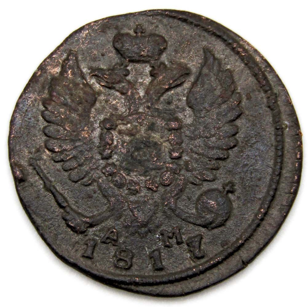 Аверс монеты Деньга 1817 года Александр I: вдоль края монеты ободок, в середине двуглавый орел с поднятыми крыльями, увенчанный тремя коронами, на груди орла герб Москвы, окруженный цепью Ордена Святого Андрея Первозванного, в левой лапе скипетр, в правой держава, слева и справа под хвостом инициалы минцмейстера «АМ» (Алексей Малеев), ниже год выпуска «1817».