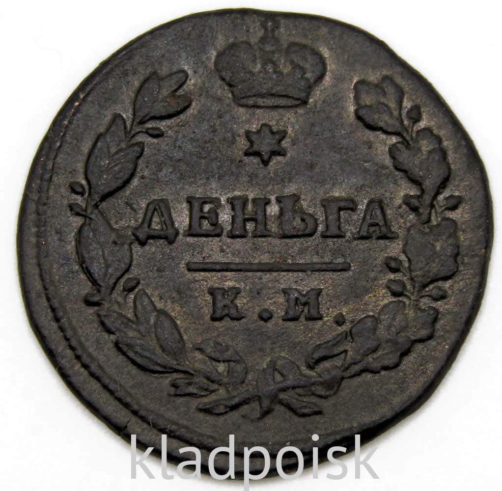 Реверс монеты: вдоль края монеты ободок, в центре вверху императорская корона, под ней шестиконечная звезда, ниже надпись «ДЕНЬГА». Слева вдоль края лавровая ветвь, справа дубовая, внизу ветви соединяются и перевязаны лентой, над ней обозначение монетного двора «КМ», выше него прямая черта.