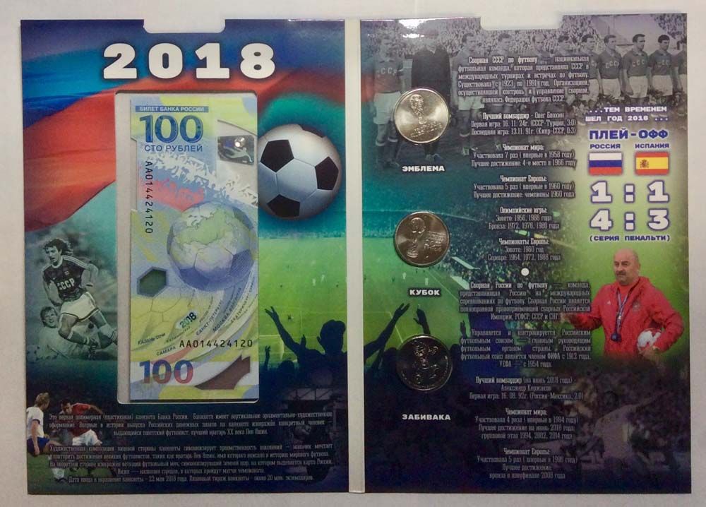 Подарочный набор: бона + 3 монеты, посвященный Чемпионату мира по футболу FIFA 2018 в России, в красочном альбоме-планшете "Чемпионат в России".