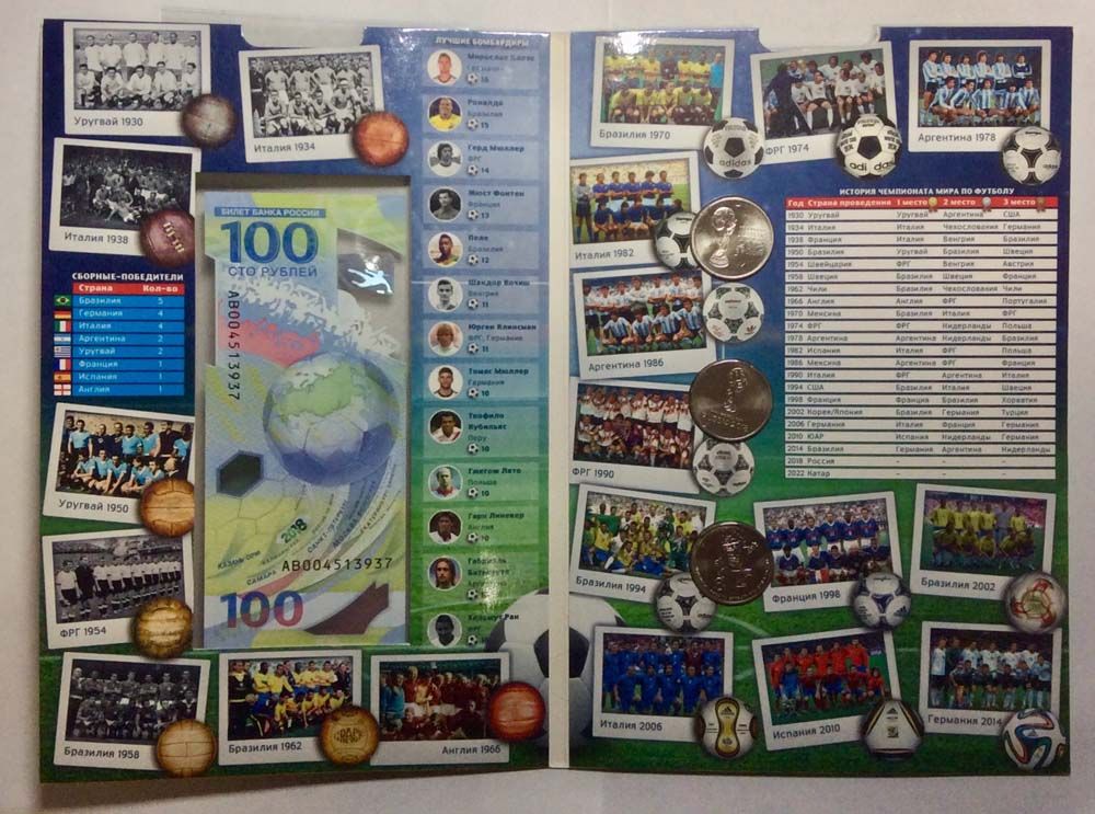 Подарочный набор: бона + 3 монеты, посвященный Чемпионату мира по футболу FIFA 2018 в России, в красочном альбоме-планшете "Футбольная битва летом 2018-го".