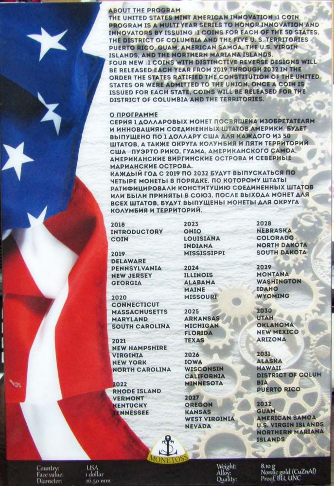 Монеты серии «Американские инновации и новаторы», характеристики каждой монеты: