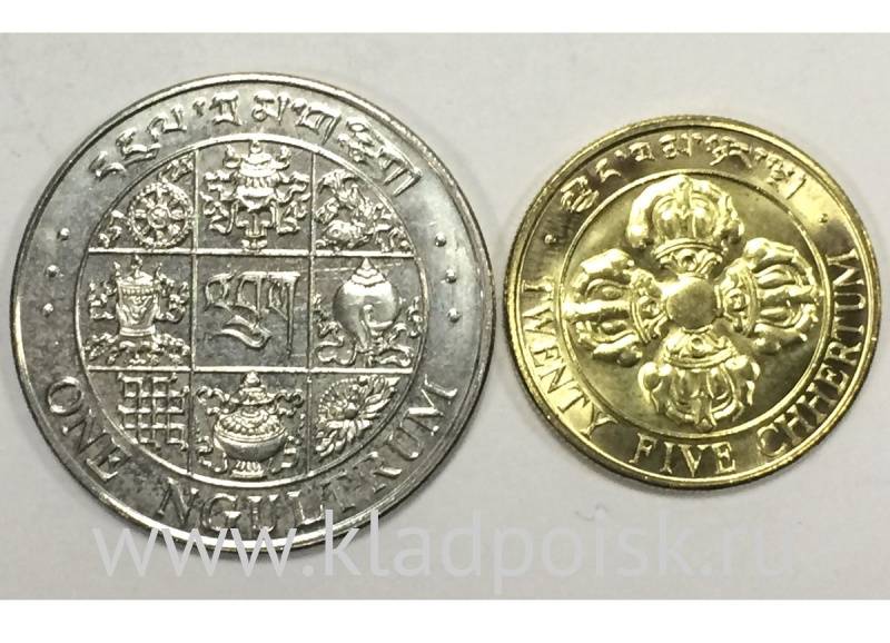 На реверсе монеты 25 четрумов четырехлепестковая эмблема и надписи – на английском языке: TWENTY FIVE CHHERTUM и на языке дзонг-кэ, год выпуска 1979.