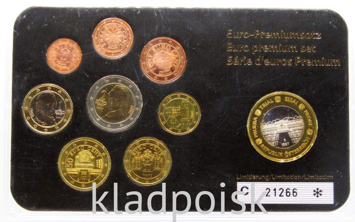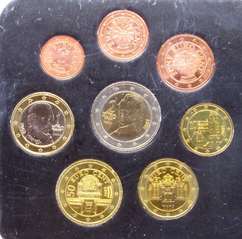 Евро монеты Австрии. В данный набор вошли монеты, выпущенные в 2002-2006 гг. и жетон.