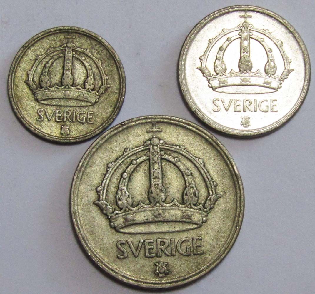 В набор входит 3 монеты разного номинала: 10, 25 и 50 ore, выпущенные в 1942-1950 годы - период правления короля Густава V.