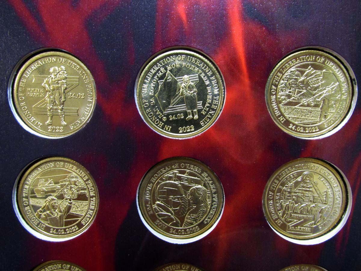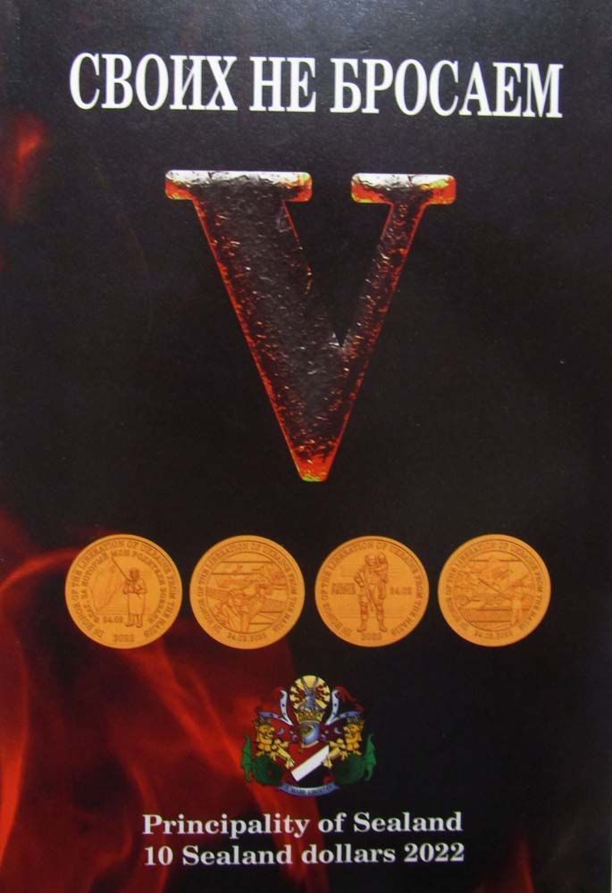 Полный комплект всех 12 выпущенных монет княжества Силенд номиналом 10 долларов 2022 г. Монеты посвящены денацификации Украины и освобождению от нацизма.