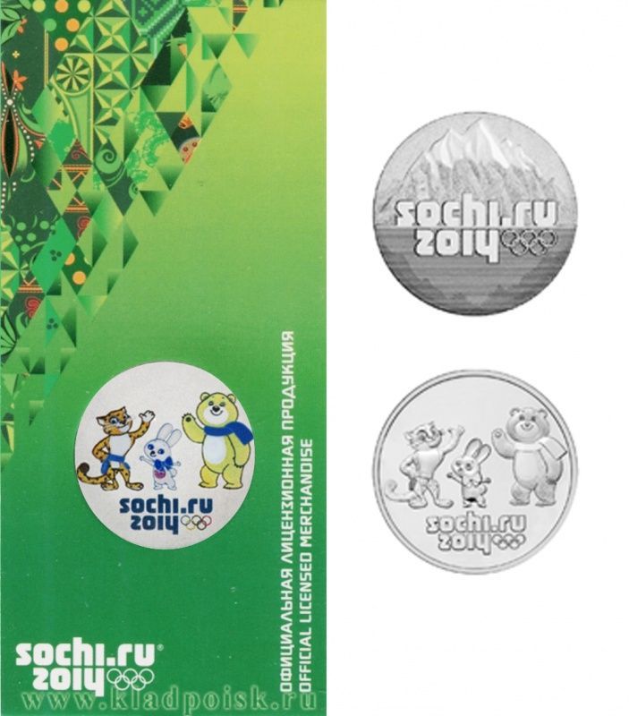 На Монете Сочи «Талисманы» изображены: Леопольд, Белый мишка и Зайка и надпись «sochi.ru» 2014 - дата проведения зимней Олимпиады.