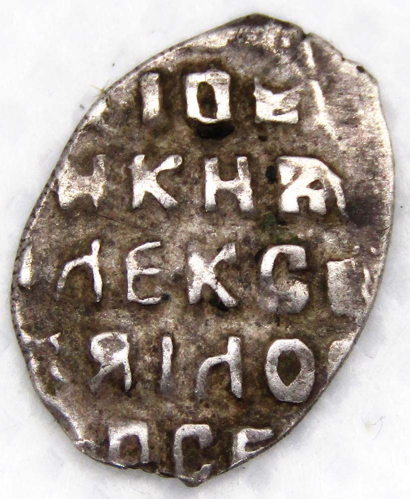 На аверсе 1 копейка серебро Алексей Михайлович (чешуя): изображение всадника, на реверсе легенда с титулом царя Алексея Михайловича.