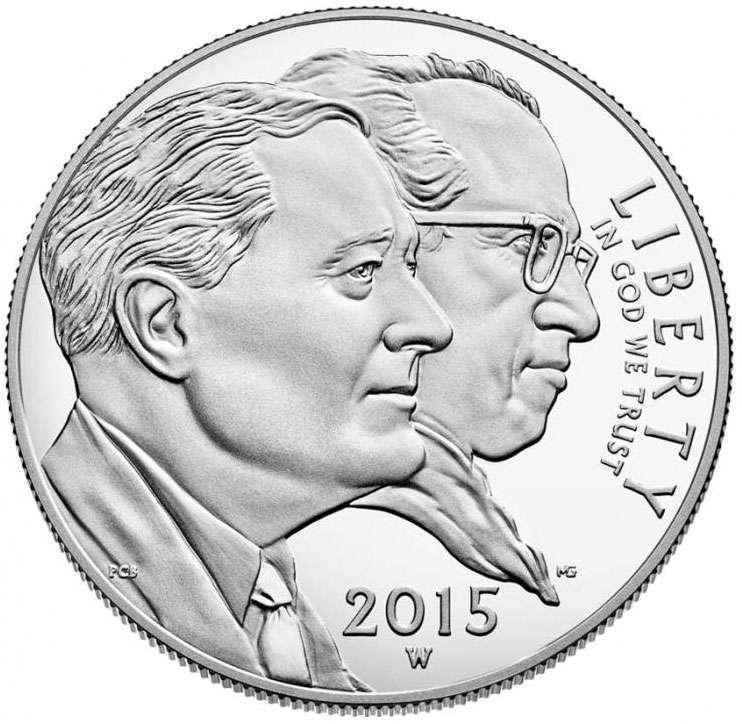 Серебряная юбилейная монета 1 доллар США 2015 года приурочена к 75-летнему юбилею со дня создания Фонда помощи детям Даймс. Монета в бархатном футляре и картонной коробке с сертификатом.