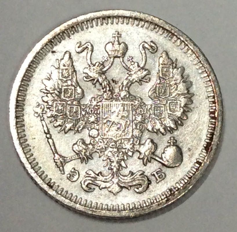 На аверсе изображение Малого Государственного Герба Российской империи образца 1856 года. Слева от хвоста - буква "Э", справа - буква "Б" (инициалы минцмейстера монетного двора).