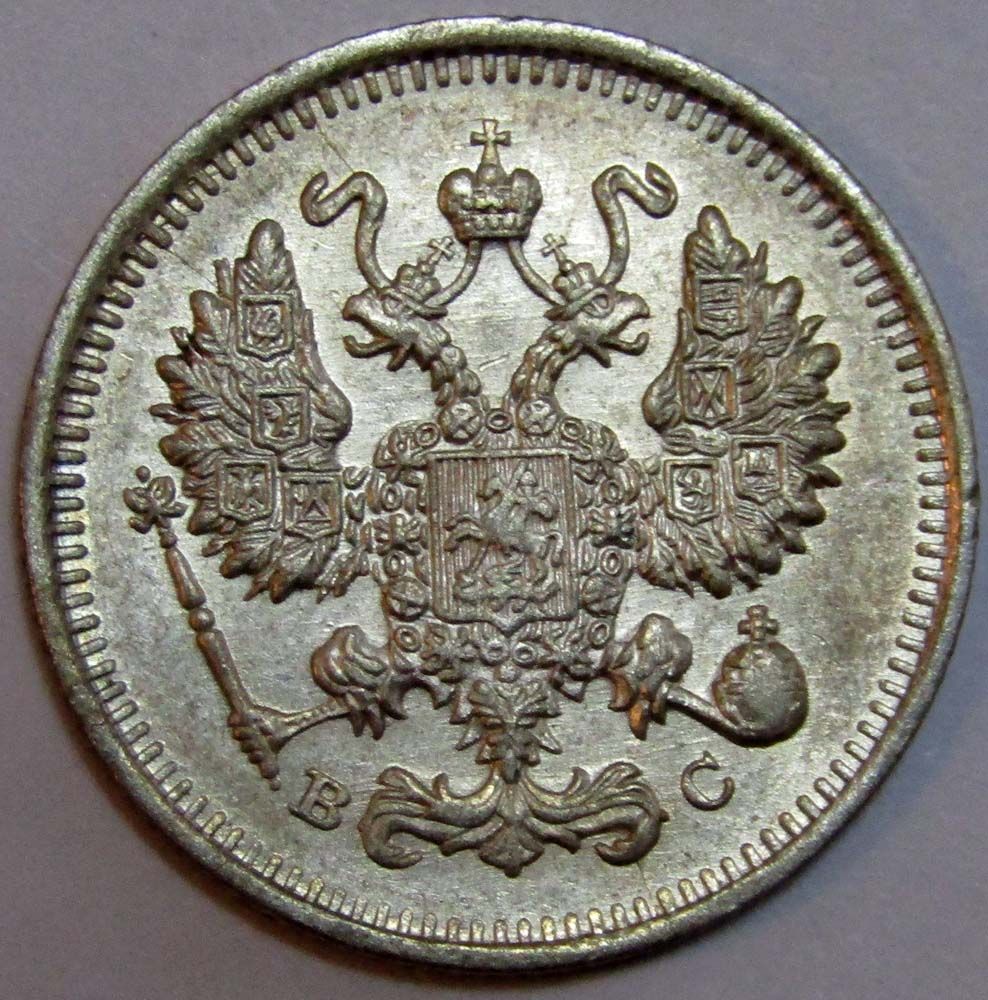 На аверсе изображение Малого Государственного Герба Российской империи образца 1856 года. Слева от хвоста - буква "В", справа - буква "С" (инициалы минцмейстера монетного двора).