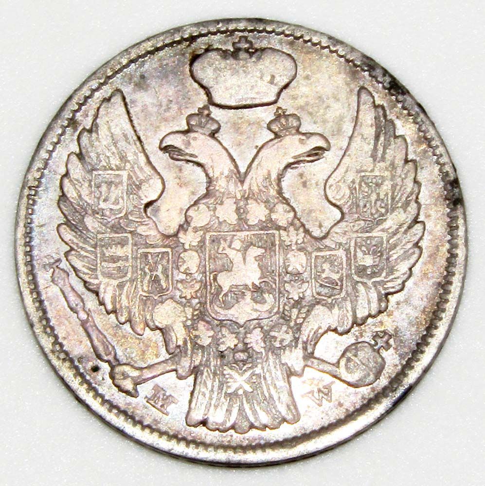 На аверсе монеты 15 копеек - 1 злотый 1837 года Российской Империи Николай I, серебро: вдоль края монеты зубчатый ободок, в середине Малый Государственный Герб Российской империи, под левой и правой лапами орла обозначение Варшавского монетного двора «MW».