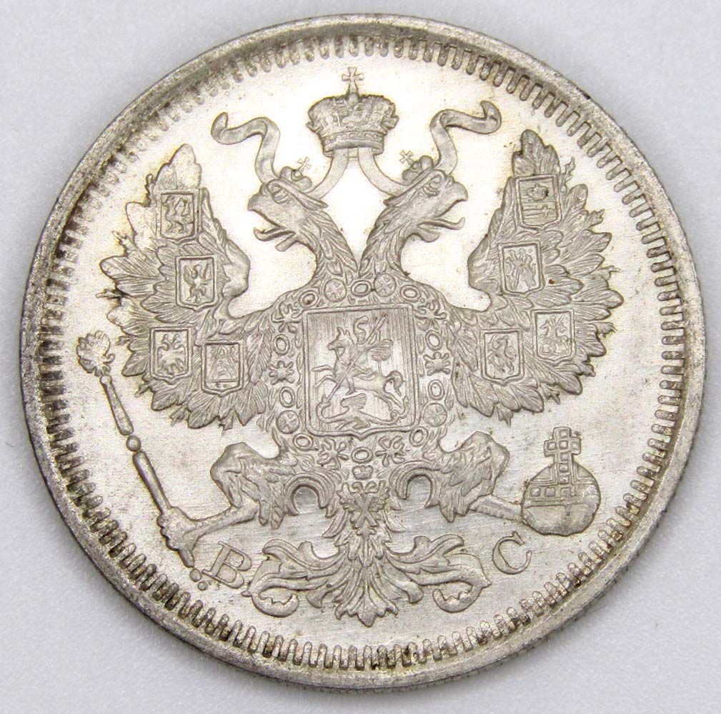 На реверсе в центре указан номинал: число "20", под ним слово "КОПЕЕК". Слева и справа от числового обозначения номинала имеется две звёздочки, над числом - имперская корона. Под номиналом орнамент в виде двух стилизованных линий, между которыми розетка. Ниже - год чеканки "1914", ещё ниже - буквы "С.П.Б.", означающие "Санкт-Петербург". По краям монеты имеется венок из двух ветвей, связанных внизу лентой.