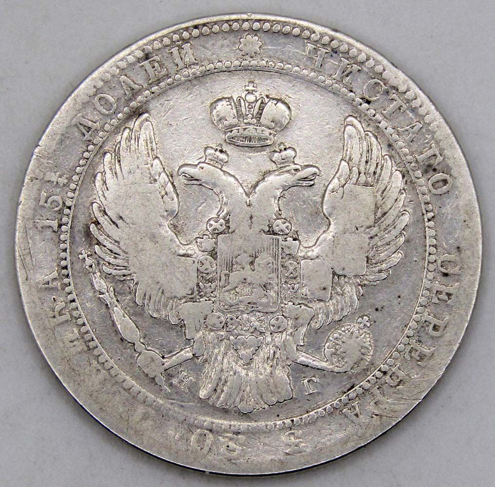На реверсе серебряной монеты 3/4 рубля - 5 злотых 1833 г.: вдоль края монеты ободок из точек, в центре вверху номинал «3/4», ниже надпись «РУБЛЯ.», под ней польский номинал «5», ниже надпись «ZLOT.» (злотых). Слева вдоль края лавровая ветвь, справа дубовая, внизу ветви соединяются и перевязаны лентой, над ней год выпуска монеты «1833.».
