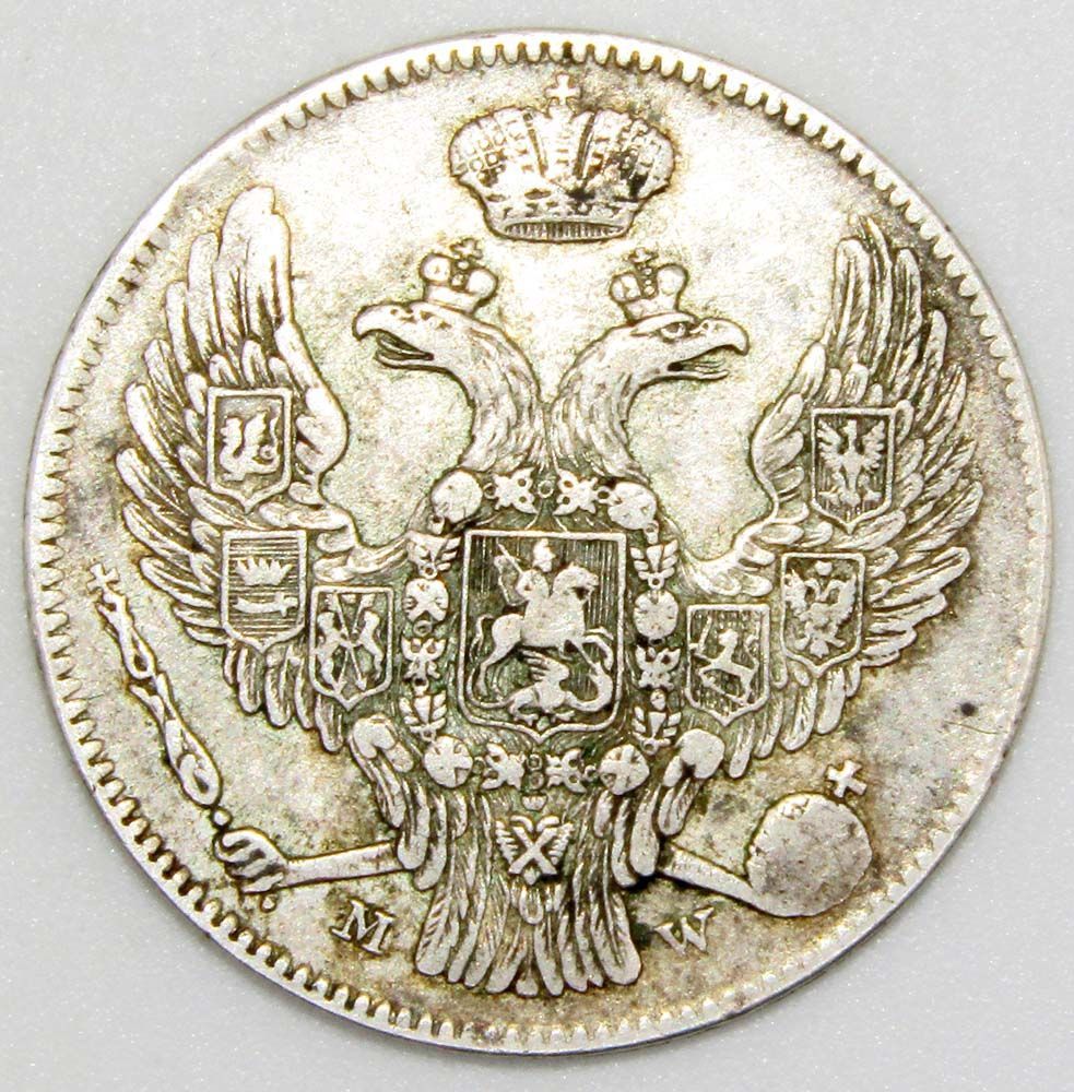 На аверсе монеты 30 копеек - 2 злотых 1838 года Российской Империи Николай I, серебро: по краю монеты зубчатый ободок, в центре Малый Государственный Герб Российской империи, под лапами орла слева буква «М», справа «W» (обозначение Варшавского монетного двора (Mennica Warszawska)).