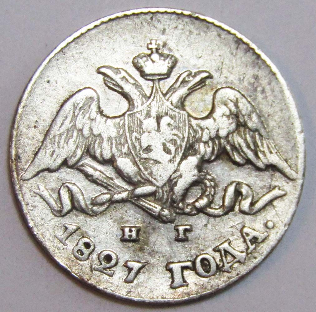 Аверс: вдоль края монеты ободок из точек, в центре двуглавый орел с крыльями, опущенными вниз, над головами императорская корона, на груди орла Московский герб с Георгием Победоносцем, поражающим дракона копьем, на коне повернутом вправо. Слева в когтях перевитый лентами факел, горящий с обеих сторон и часть ленты, справа в когтях - лавровый венок и вторая часть ленты, под ней слева и справа инициалы минцмейстера «НГ» (Николай Грачев), снизу по краю монеты год выпуска «1827 ГОДА.».