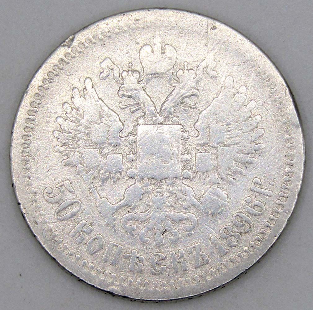 На реверсе монеты 50 копеек 1896 года (полтина) - Николай II изображен герб Российской Империи – двуглавый орел в коронах, в лапах орла - скипетр и держава. Третья корона венчает обе первые. На груди орла щит с изображением Георгия Победоносца, на крыльях маленькие щиты с гербами губерний, подчиненных Российской Империи. Под гербом расположены номинал монеты и год выпуска.