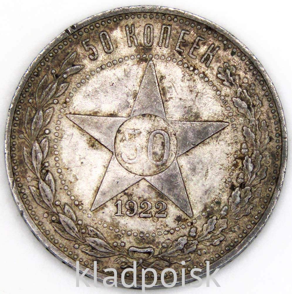 На аверсе монеты серебряный полтинник 1922 года - герб РСФСР, окруженный венком из колосьев, щит с изображением серпа и молота на фоне солнечных лучей, надписи по окружности - «ПРОЛЕТАРИИ ВСЕХ СТРАН, СОЕДИНЯЙТЕСЬ!», «Р.С.Ф.С.Р.».