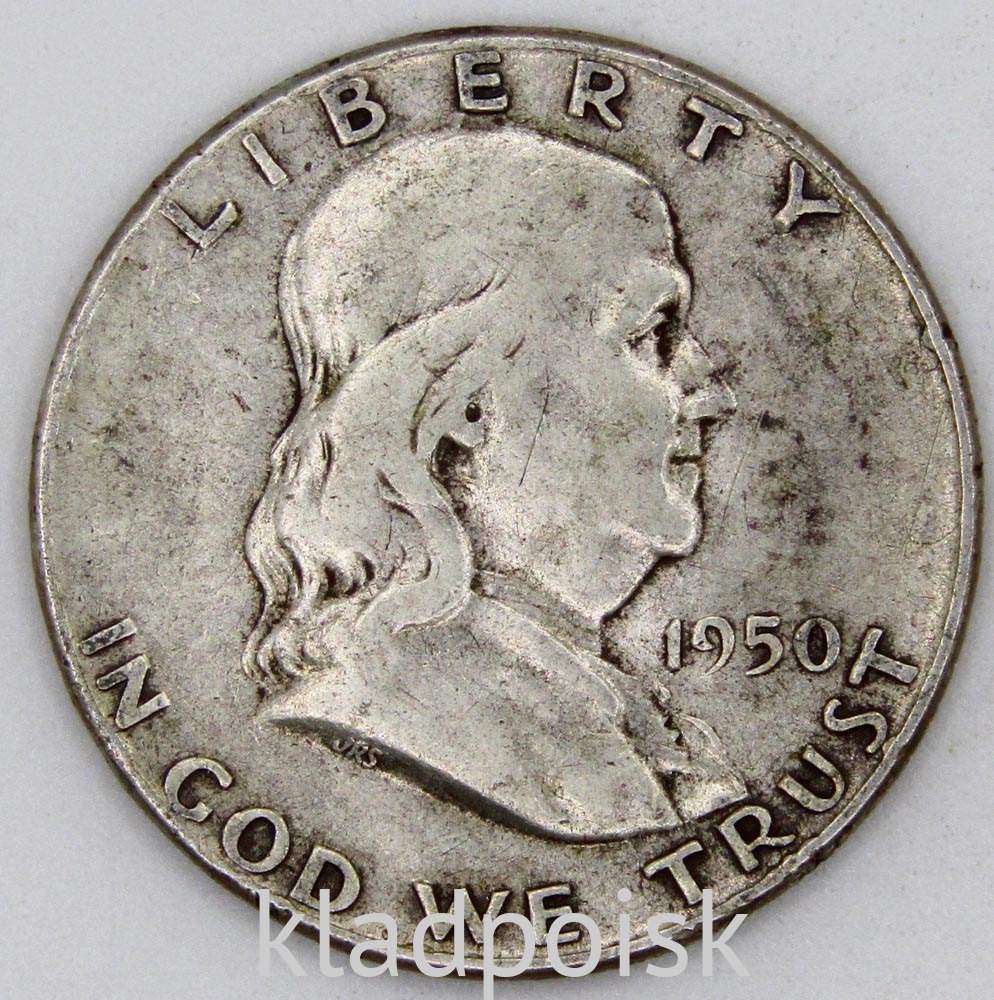 На аверсе монеты 50 центов США Серебро «Франклин» 1950 года изображен профиль Бенджамина Франклина.