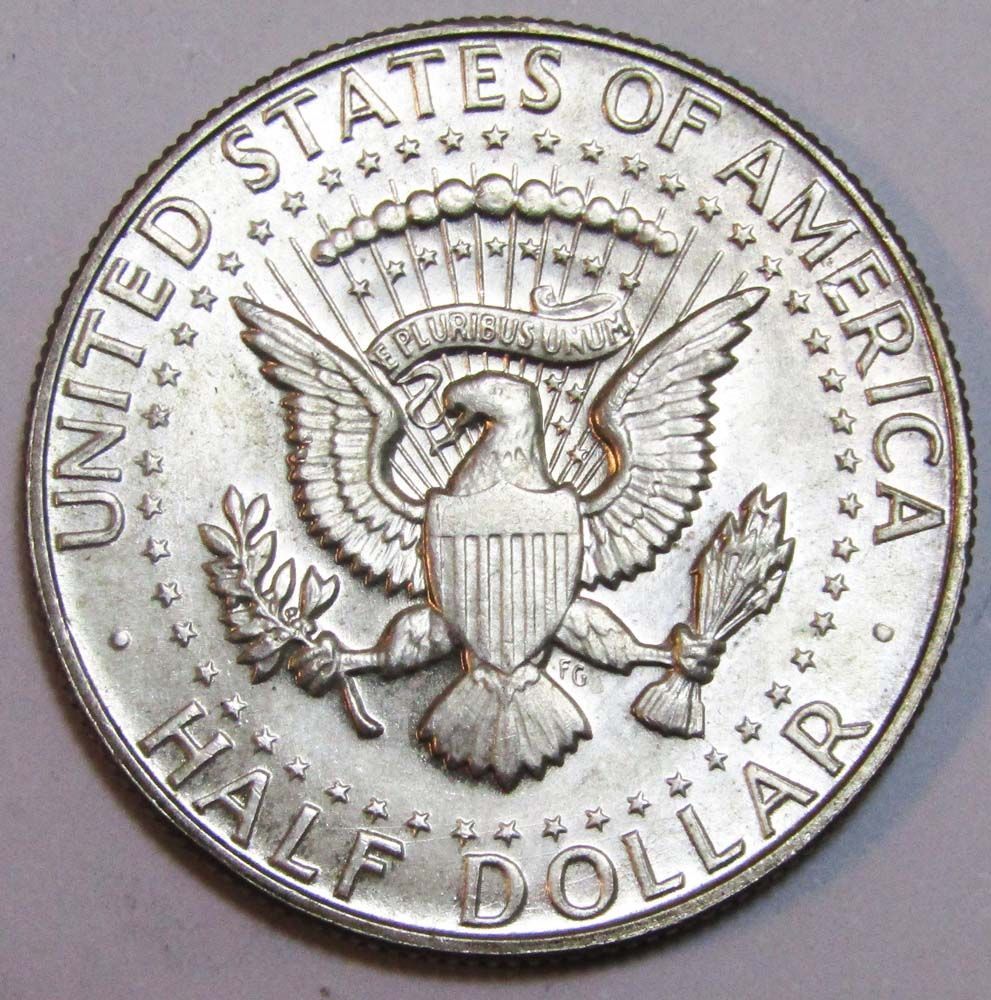 На реверсе монеты 50 центов США «Кеннеди» 1966г. Серебро 400 пр. изображена большая печать США; внизу номинал полукругом: HALF DOLLAR. Вверху полукругом надпись: UNITED STATES OF AMERICA.