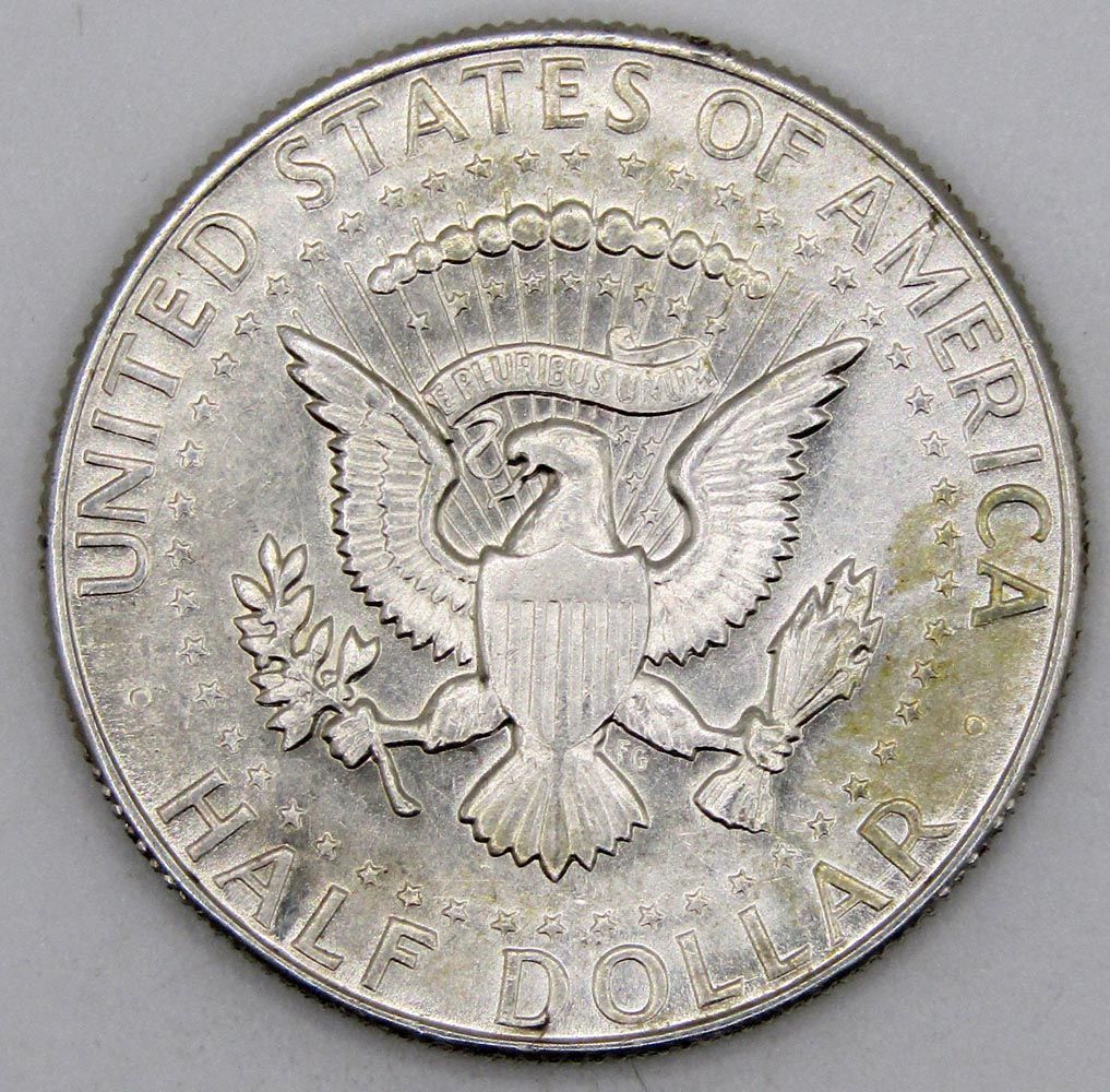 На реверсе монеты 50 центов США «Кеннеди» 1966г. Серебро 400 пр. изображена большая печать США; внизу номинал полукругом: HALF DOLLAR. Вверху полукругом надпись: UNITED STATES OF AMERICA.
