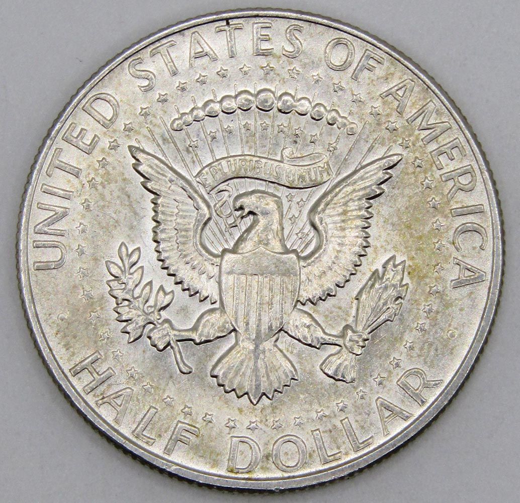 На реверсе монеты 50 центов США «Кеннеди» 1968г. Серебро 400 пр. изображена большая печать США; внизу номинал полукругом: HALF DOLLAR. Вверху полукругом надпись: UNITED STATES OF AMERICA.