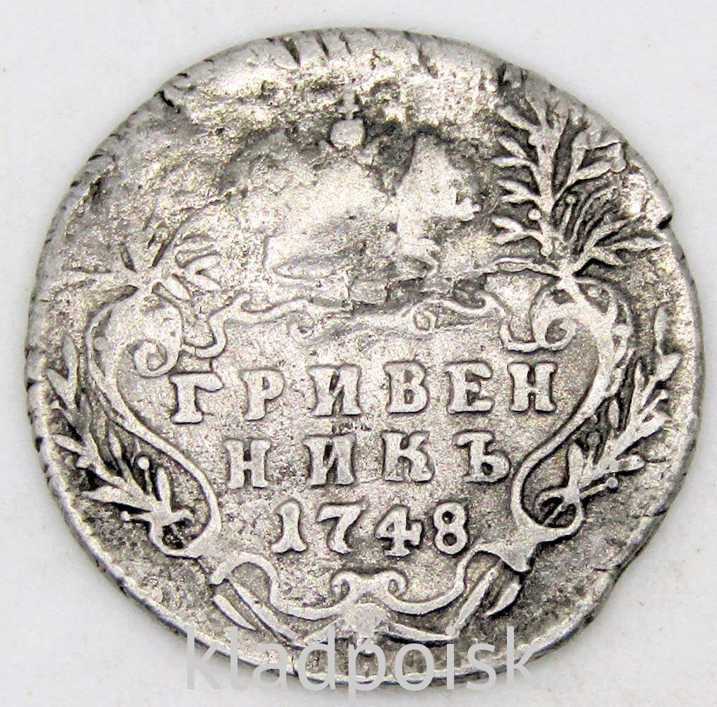 Реверс: в центре в фигурном картуше надпись «ГРИВЕН», под ней - «НИК», (гривенник), ниже год чеканки «1748». Картуш увенчан императорской короной.