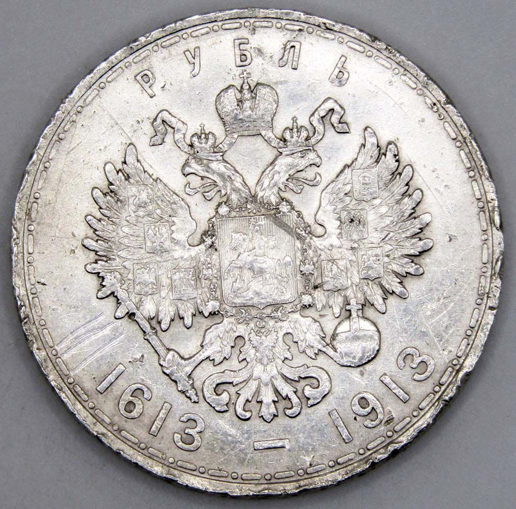 На аверсе: сверху вдоль края монеты обозначение достоинства «РУБЛЬ», ниже Малый Государственный Герб Российской империи, под ним год воцарения династии Романовых и год выпуска монеты «1613-1913».