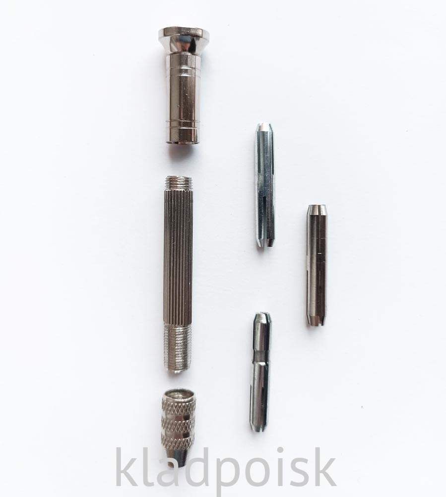 Держатель применяется для крепления шаберов и ручных сверл. В комплекте к держателю прилагаются три переходника для разных диаметров хвостовиков. Первый переходник уже закреплен в держателе, второй располагается во внутреннем отсеке, третий прилагается отдельно.