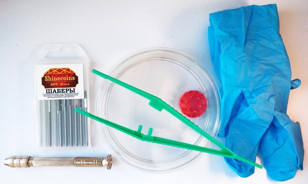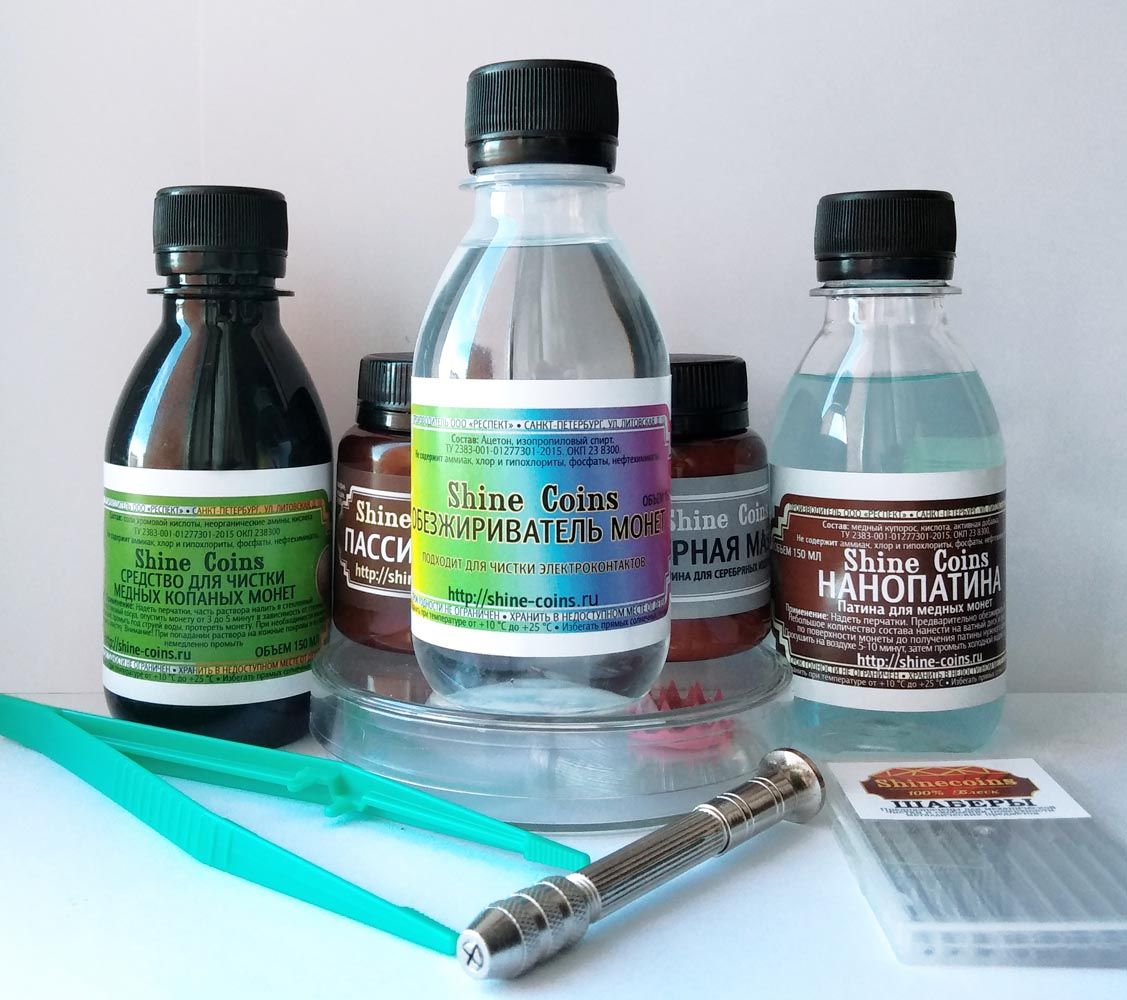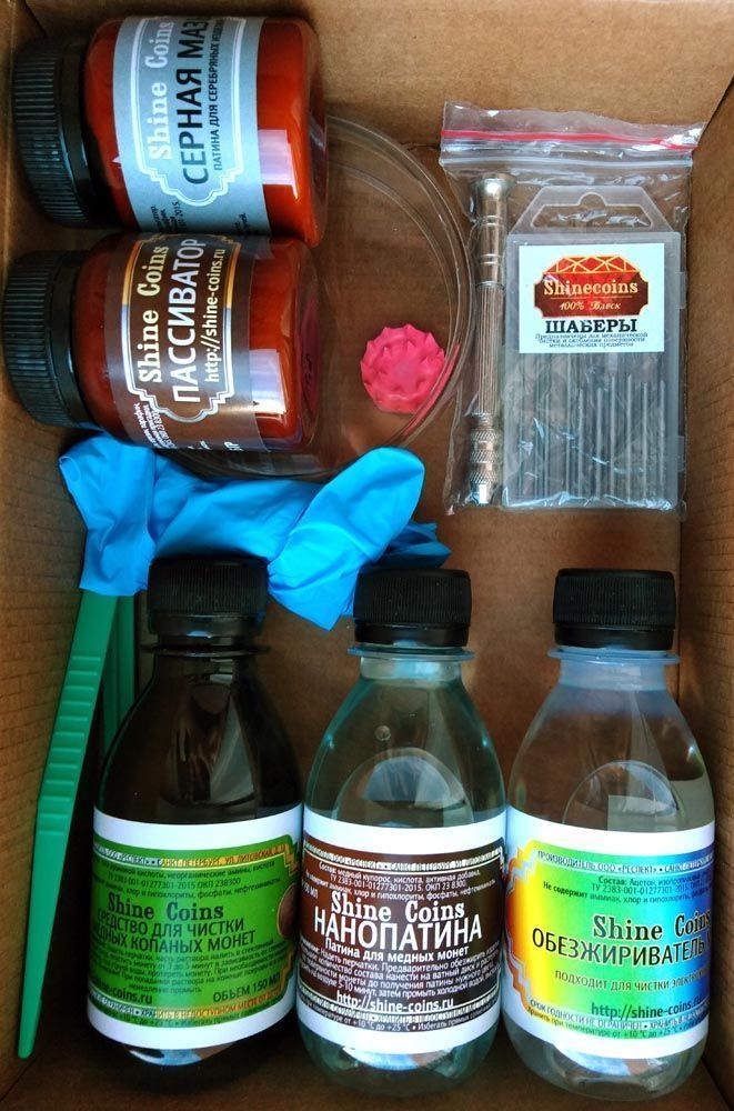 Набор включает в себя все необходимое для работы с медными монетами и другими медными изделиями: