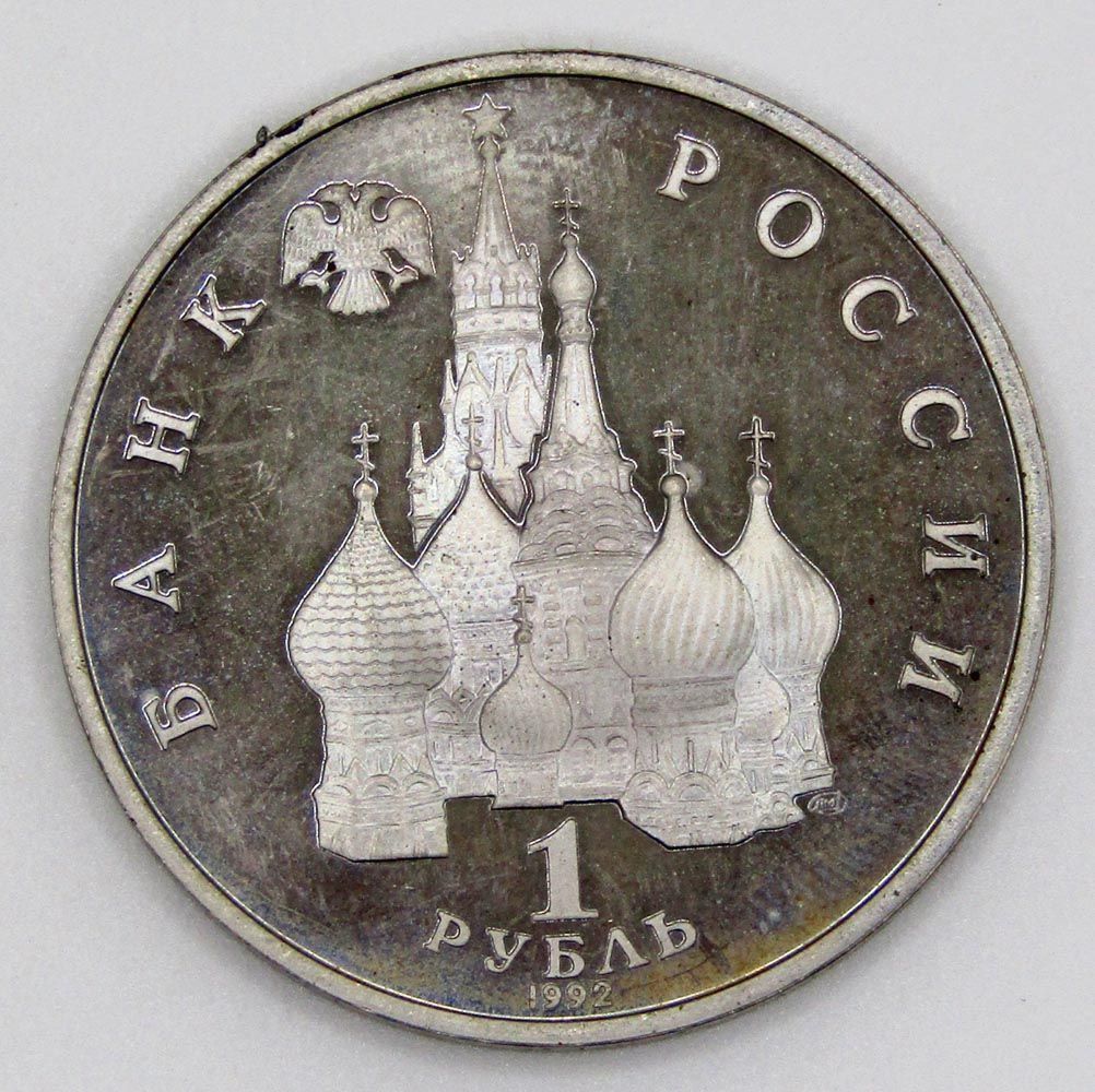 На аверсе монеты 1 рубль 1992 год 110 лет со дня рождения Я. Коласа: в центре диска – изображения куполов собора Покрова на рву и Спасской башни, слева над ними – двуглавый орел, справа под ними – товарный знак монетного двора, по окружности – надписи: вверху – «БАНК РОССИИ», внизу в три строки – «1 РУБЛЬ» «1992».