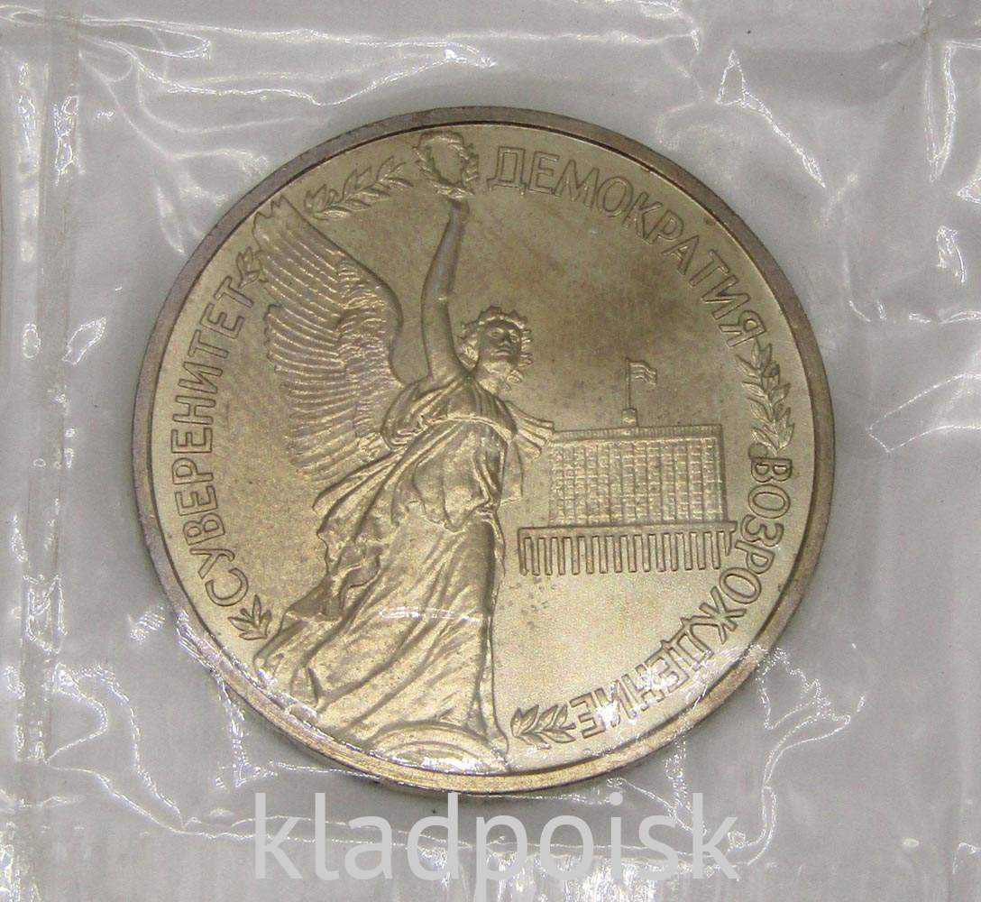 На реверсе монеты 1 рубль 1992 год «Суверенитет, Демократия, Возрождение» скульптурное изображение богини Победы с венком в руке на фоне Дома Советов Российской Федерации в Москве, по окружности - надписи: "СУВЕРЕНИТЕТ", "ДЕМОКРАТИЯ", "ВОЗРОЖДЕНИЕ", разделённые лавровыми ветвями.