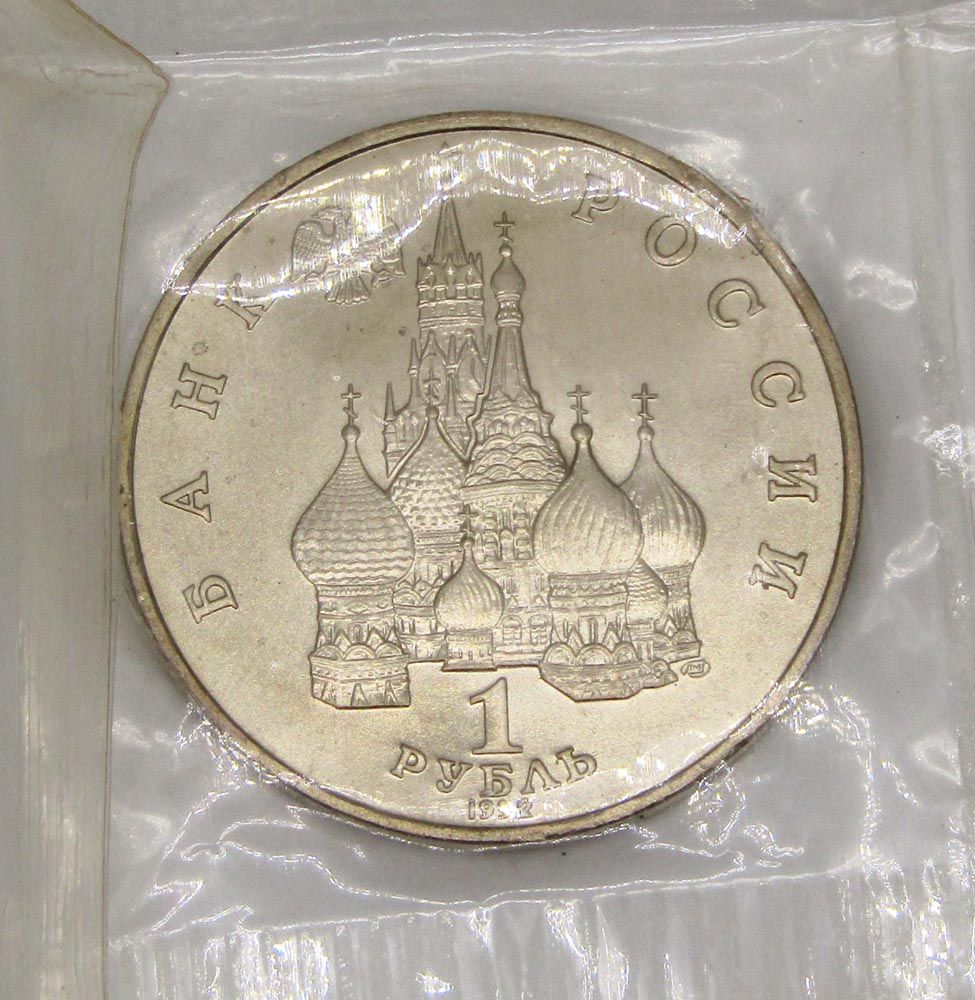 На аверсе монеты 1 рубль 1992 год «Суверенитет, Демократия, Возрождение»: в центре диска - изображения куполов собора Покрова на рву и Спасской башни, слева над ними - двуглавый орёл, справа под ними - товарный знак монетного двора, по окружности - надписи: вверху - "БАНК РОССИИ", внизу в три строки - "1 РУБЛЬ" "1992".