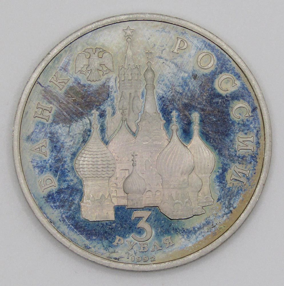 На аверсе монеты 3 рубля 1992 года «750 лет победы Александра Невского на Чудском озере»: в середине изображение куполов собора Покрова на рву и Спасской башни, слева над ними - двуглавый орёл, справа под ними - товарный знак монетного двора, по окружности - надписи: вверху – «БАНК РОССИИ», «3 РУБЛЯ» «1992».