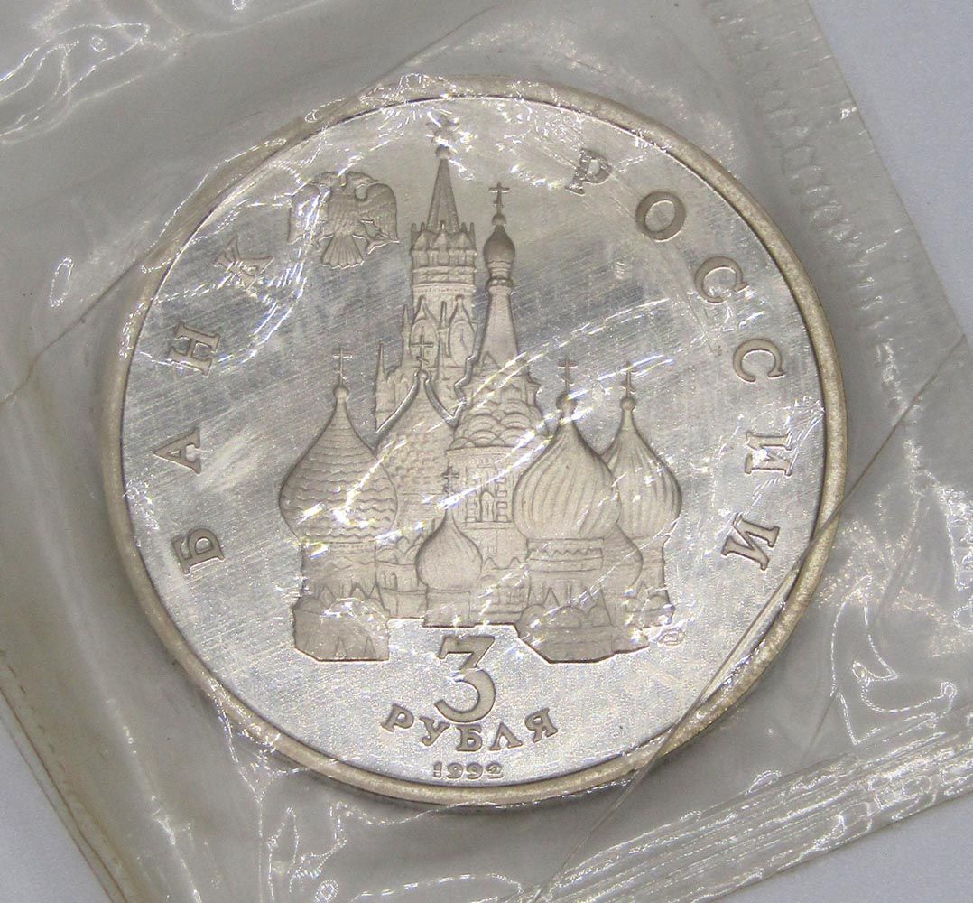 На аверсе монеты 3 рубля 1992 года «750 лет победы Александра Невского на Чудском озере»: в середине изображение куполов собора Покрова на рву и Спасской башни, слева над ними - двуглавый орёл, справа под ними - товарный знак монетного двора, по окружности - надписи: вверху – «БАНК РОССИИ», «3 РУБЛЯ» «1992».
