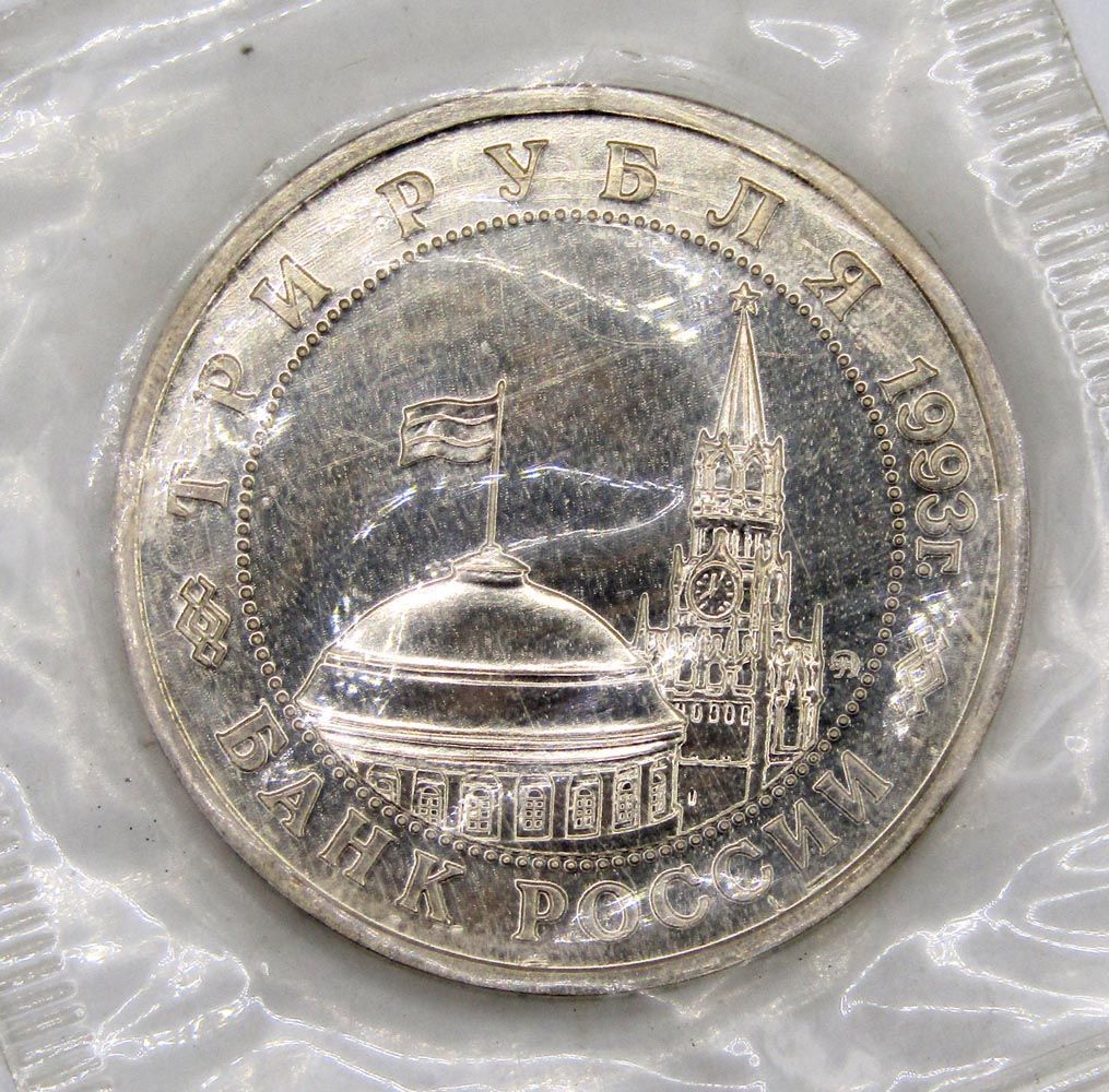 На аверсе монеты 3 рубля 1993 год «50-летие освобождения Киева от фашистских захватчиков»: в центре диска — в центре диска - изображения купола здания Сената и Спасской башни Московского Кремля, справа от них - товарный знак монетного двора. По окружности надписи, обрамлённые кругом из точек: вверху – «ТРИ РУБЛЯ 1993 г.», внизу – «БАНК РОССИИ».