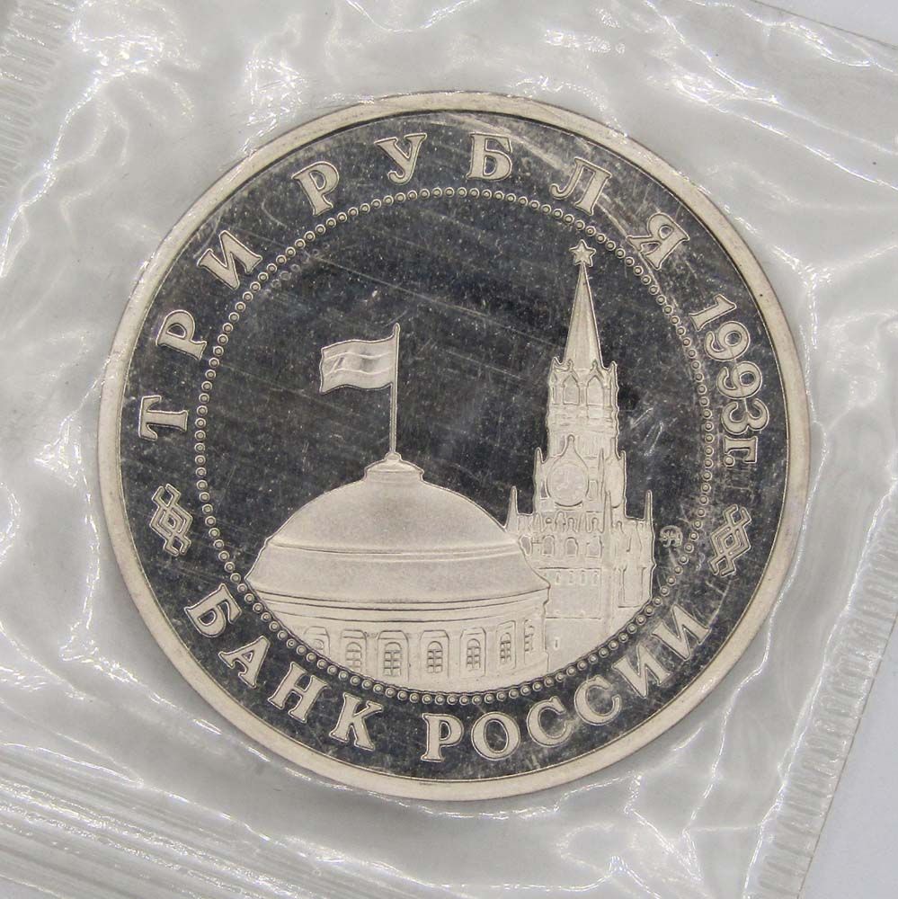 На аверсе монеты 3 рубля 1993 год «50-летие освобождения Киева от фашистских захватчиков»: в центре диска — в центре диска - изображения купола здания Сената и Спасской башни Московского Кремля, справа от них - товарный знак монетного двора. По окружности надписи, обрамлённые кругом из точек: вверху – «ТРИ РУБЛЯ 1993 г.», внизу – «БАНК РОССИИ».